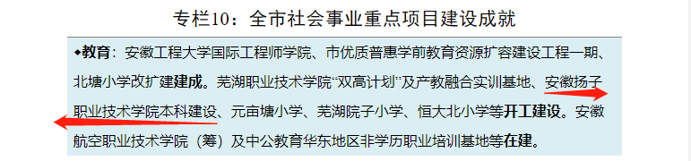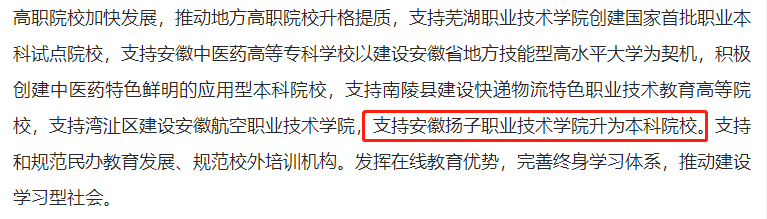 目前支持安徽揚(yáng)子職業(yè)技術(shù)學(xué)院升為本科院校已寫入《中共蕪湖市委關(guān)于制定國民經(jīng)濟(jì)和社會發(fā)展第十四五規(guī)劃和2035年遠(yuǎn)景目標(biāo)的建議》